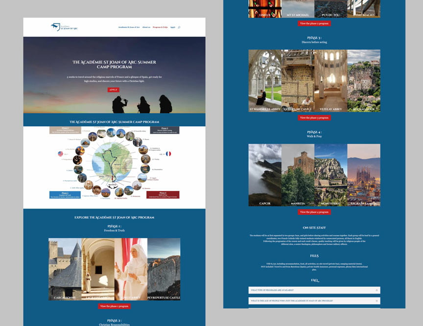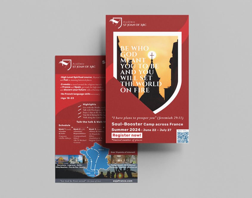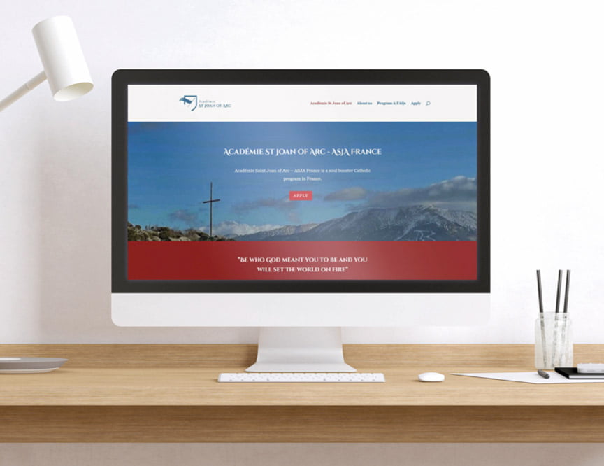 Direction artistique et création de l’identité visuelle de l’Académie St Joan of Arc – ASJA. Conception du logo, de la charte graphique, typographie et colorimétrie. Déclinaison de l’identité créée sur des flyers. Design et développement du site web sur mesure asjafrance.com